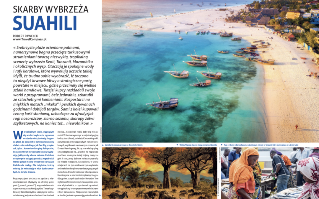 W najświeższym, letnim, aż 216-stronicowym, wydaniu magazynu „All Inclusive” – to już jest nasz numer 49., kolejne wydanie będzie jubileuszowe, 50., z mnóstwem atrakcji – w dziale „Dalekie Podróże” Robert Pawełek, TravelCompass, zaprasza nas do odkrycia skarbów wybrzeża Suahili – Kenii, Tanzanii, Zanzibaru i Mozambiku. Poniżej publikujemy początek jego artykułu. Cały tekst o fascynującym wybrzeżu Suahili można przeczytać na str. 22–31 najnowszego, letniego numeru magazynu „All Inclusive”, który dostępny jest pod tym linkiem: https://www.all-inclusive.com.pl/najnowszy-numer/