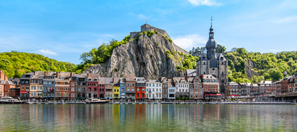 Colorful image with buildings and citadel along the Meuse river in Dinant, Wallonia, Belgium.