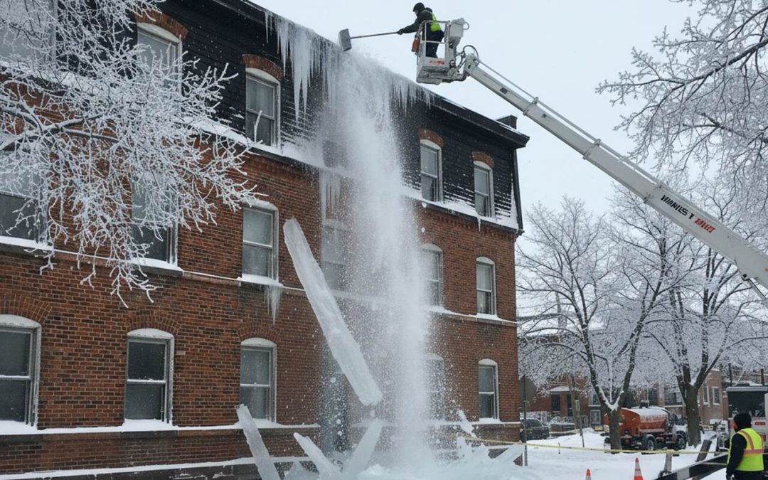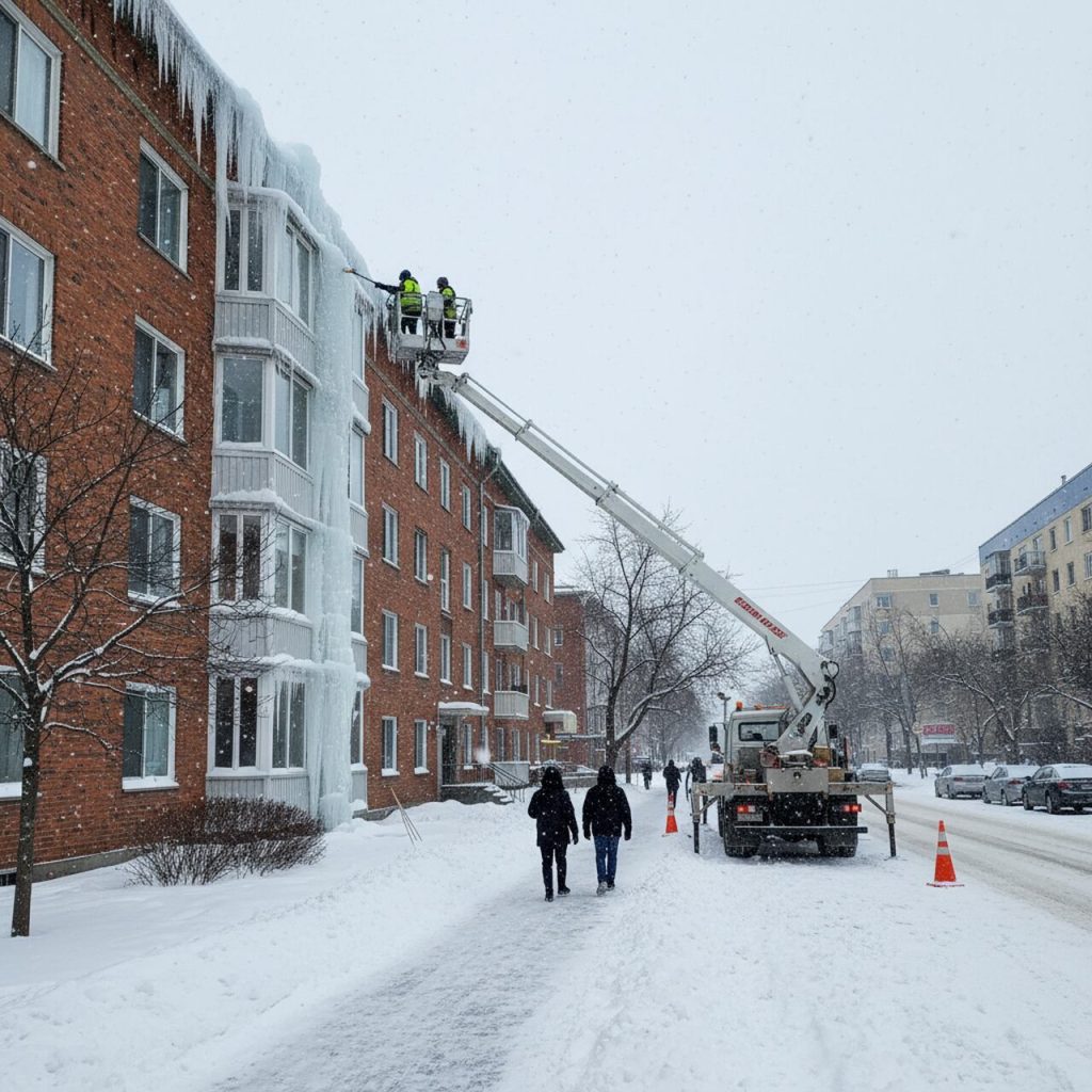 Równolegle z zagrożeniami na poziomie jezdni pojawia się problem bezpieczeństwa w obszarach zabudowanych. Intensywne opady śniegu, a następnie jego topnienie i ponowne zamarzanie prowadzą do powstawania masywnych sopli lodu oraz nawisów śnieżnych na dachach budynków. Elementy te stanowią realne i bezpośrednie zagrożenie dla pieszych, pojazdów oraz infrastruktury miejskiej. Tradycyjne metody ich usuwania, wymagające pracy na śliskich i pochyłych powierzchniach dachowych, wiążą się z wysokim ryzykiem wypadków i ograniczoną efektywnością.