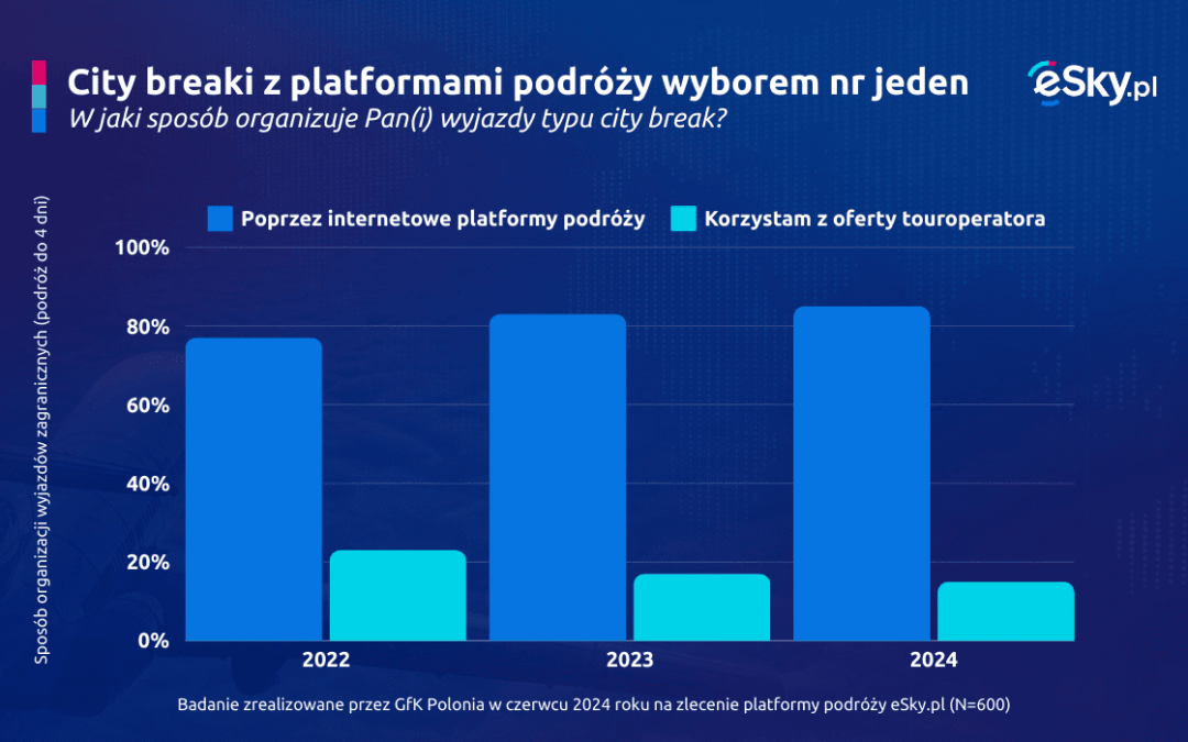 Podróże nie ograniczają się tylko do wakacji latem lub poza sezonem. Wraz z nadejściem jesieni – a więc też ustępującymi upałami i nieco bardziej napiętym grafikiem w pracy, szkole czy na studiach – w planach wyjazdowych Polaków zaczynają królować city breaki. Trwające maksymalnie do czterech dni pomagają szybko zmienić otoczenie i urozmaicić rutynę. Badanie GfK i platformy podróży eSky.pl zrealizowane w 2024 roku pokazuje, jak Polacy organizują krótkie wypady, które kwestie są dla nich kluczowe przy wyborze kierunku oraz ile rodacy wydają na city breaki z lotem i hotelem w pakiecie.