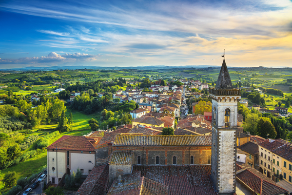 Vinci village, Leonardo’s birthplace, aerial view and bell tower of the church. Florence, Tuscany Italy Europe