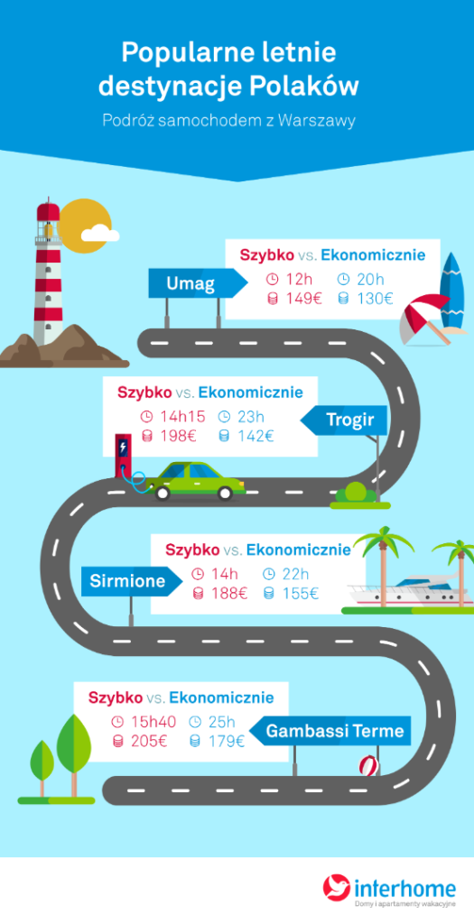 Absolutnym hitem tego sezonu są wakacje nad Jeziorem Garda. Wśród klientów Interhome najpopularniejsze jest położone na południu jeziora miasteczko Sirmione. Najszybciej można tutaj dojechać przez Czechy (1.523 €/l) i Austrię (1.564 €/l) trasą A2, A23 pokonując 1380 km w nieco ponad 14 godzin. Koszt paliwa to około 136 € i do tego winiety i opłaty drogowe 52 €, czyli łączny koszt to około 188 €.