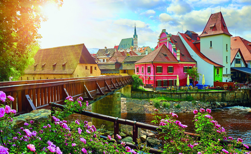Czech Krumlov, (Cesky Krumlov), Czech Republic. Wooden bridge over river Vltava. Vintage picturesque old town with colorful houses and chapel of church. Rose flowers on bank. Sunny summer day.