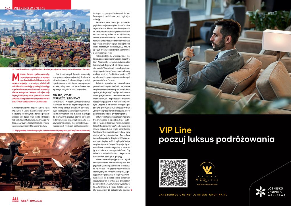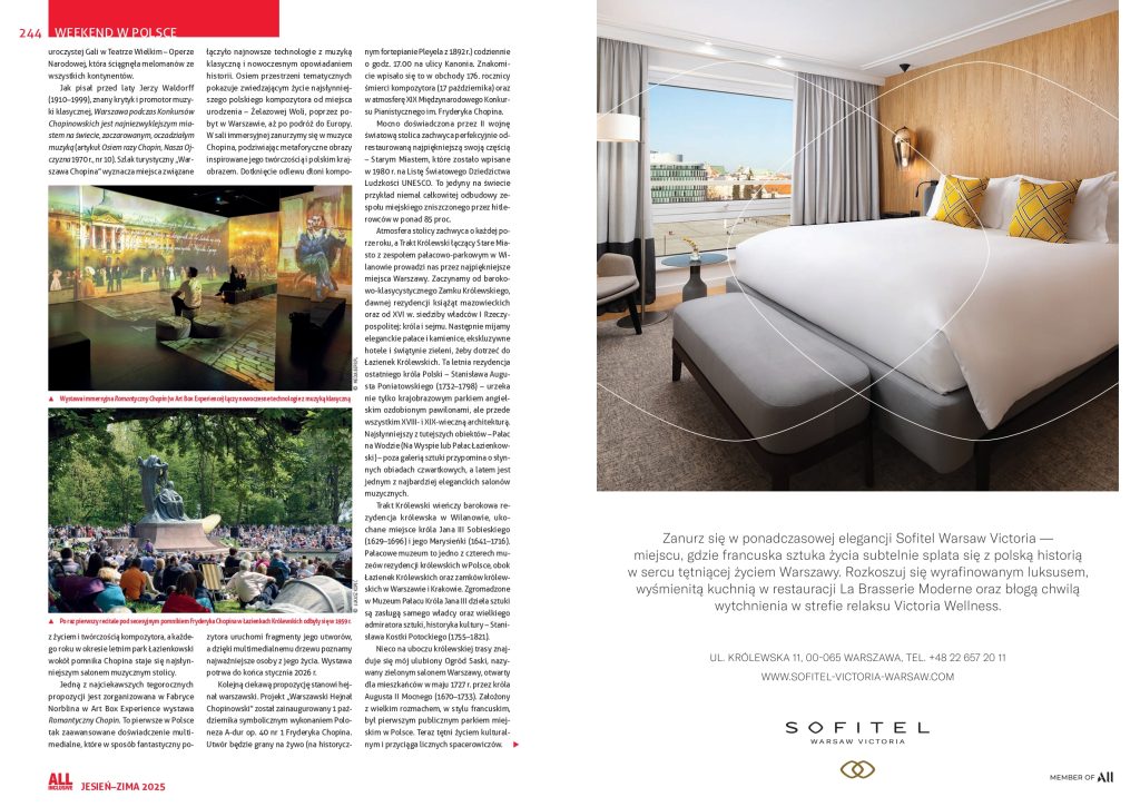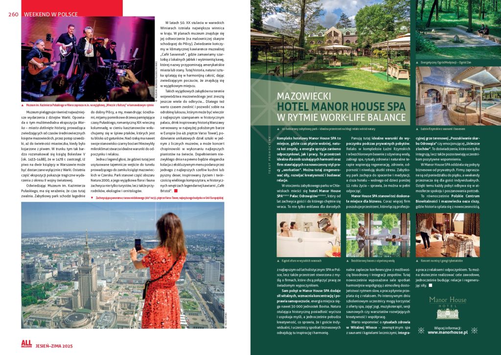 W najnowszym, 58. już wydaniu magazynu „All Inclusive” w dziale „Weekend w Polsce” Barbara Tekieli, nasza specjalistka od turystyki w Polsce, przybliża nam Mazowieckie, poszukując w tym malowniczym województwie w sercu Polski oaz luksusu. Zaczyna swój niezmiernie interesujący artykuł w następujący sposób: „Podróże po Mazowszu zawsze stymulują mnie do odkrywania nowych, niezwykłych miejsc, piękna ducha przeszłości i teraźniejszości oraz inspiracji dla przyszłości. W tych poszukiwaniach ważne miejsce zajmuje stolica – miasto niezwykłe pod wieloma względami, na długo pozostające w pamięci. Tutejsze nowoczesne multimedialne muzea, galerie sztuki, rezydencje królewskie, pałace, ekskluzywne restauracje i hotele oraz obiekty postindustrialne, które zyskały drugie życie, stwarzają przestrzeń do spotkań biznesowych na najwyższym światowym poziomie. Uzupełnieniem tych ostatnich są wydarzenia kulturalne oraz międzynarodowe festiwale muzyczne, w tym najsłynniejszy z nich – Międzynarodowy Konkurs Pianistyczny im. Fryderyka Chopina. Miejsca z dala od zgiełku, emanujące pozytywną energią oraz słynące z doskonałej kuchni i luksusowych wnętrz znajdują coraz więcej wielbicieli wśród osób poszukujących drogi do osiągnięcia dobrostanu oraz harmonii pomiędzy ciałem a umysłem. Jednym z nich jest najlepszy holistyczny hotel spa w Polsce – mazowiecki kompleks hotelowy Manor House SPA – Pałac Odrowążów w Chlewiskach. Równie ekskluzywne miejsce stanowi Pałac Mała Wieś w „największym sadzie Europy” na Szlaku Jabłkowym na terenie powiatu grójeckiego. Będąc tutaj, warto odwiedzić też unikatowe Muzeum im. Kazimierza Pułaskiego w Warce, łączące historię z nowoczesnością w niezwykłej scenerii natury. Fani ekstremalnych doznań z pewnością skorzystają z najnowszej atrakcji Szydłowca – Kamieniołomu Podkowińskiego, tudzież z poziomu 230 m nad ziemią spojrzą na panoramę stolicy ze szczytu Varso Tower – najwyższego budynku w Unii Europejskiej.”