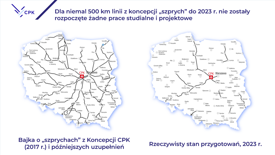 Rzeczywisty stan przygotowań był taki, że prawie 500 km linii  (z obiecanych 2 000 km) do 2023 r. nie rozpoczęły się nawet żadne prace studialne i projektowe.