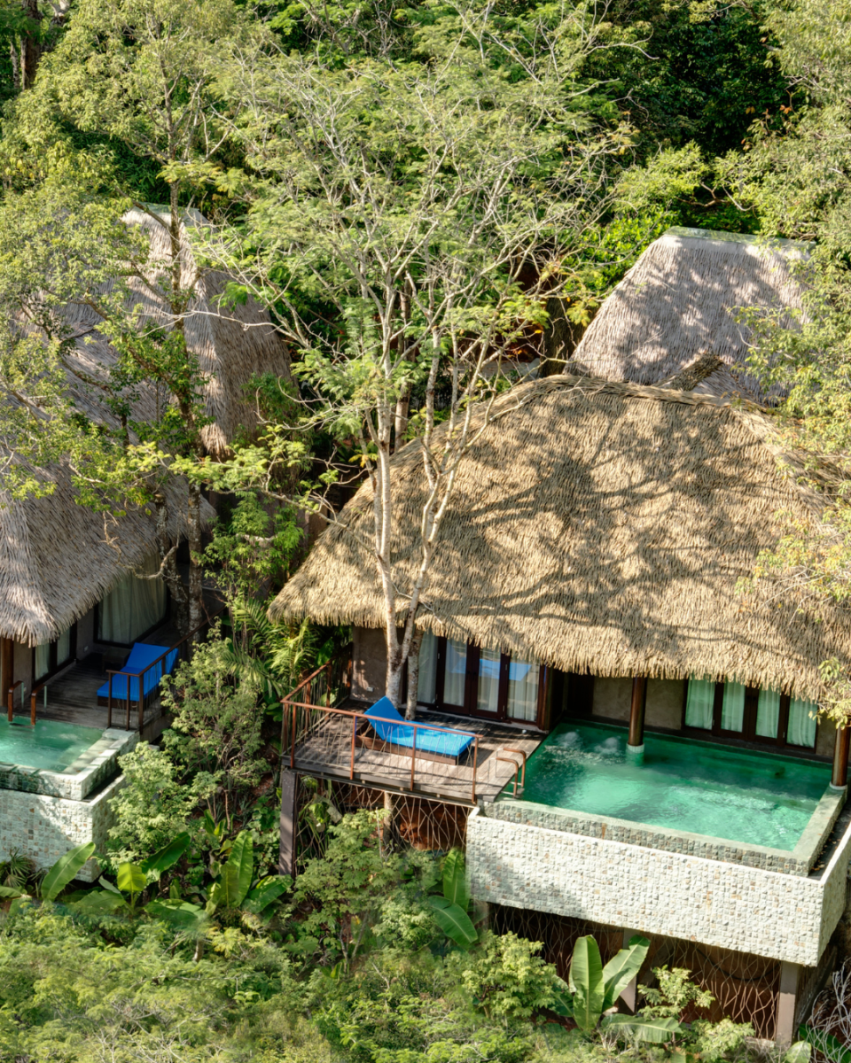The Bird’s Nest Villas overlook the ocean, rainforest, and resort. The spacious bathroom has a monsoon shower and a freestanding bathtub with views. The villa spans 185 m² including a pool and sundeck.