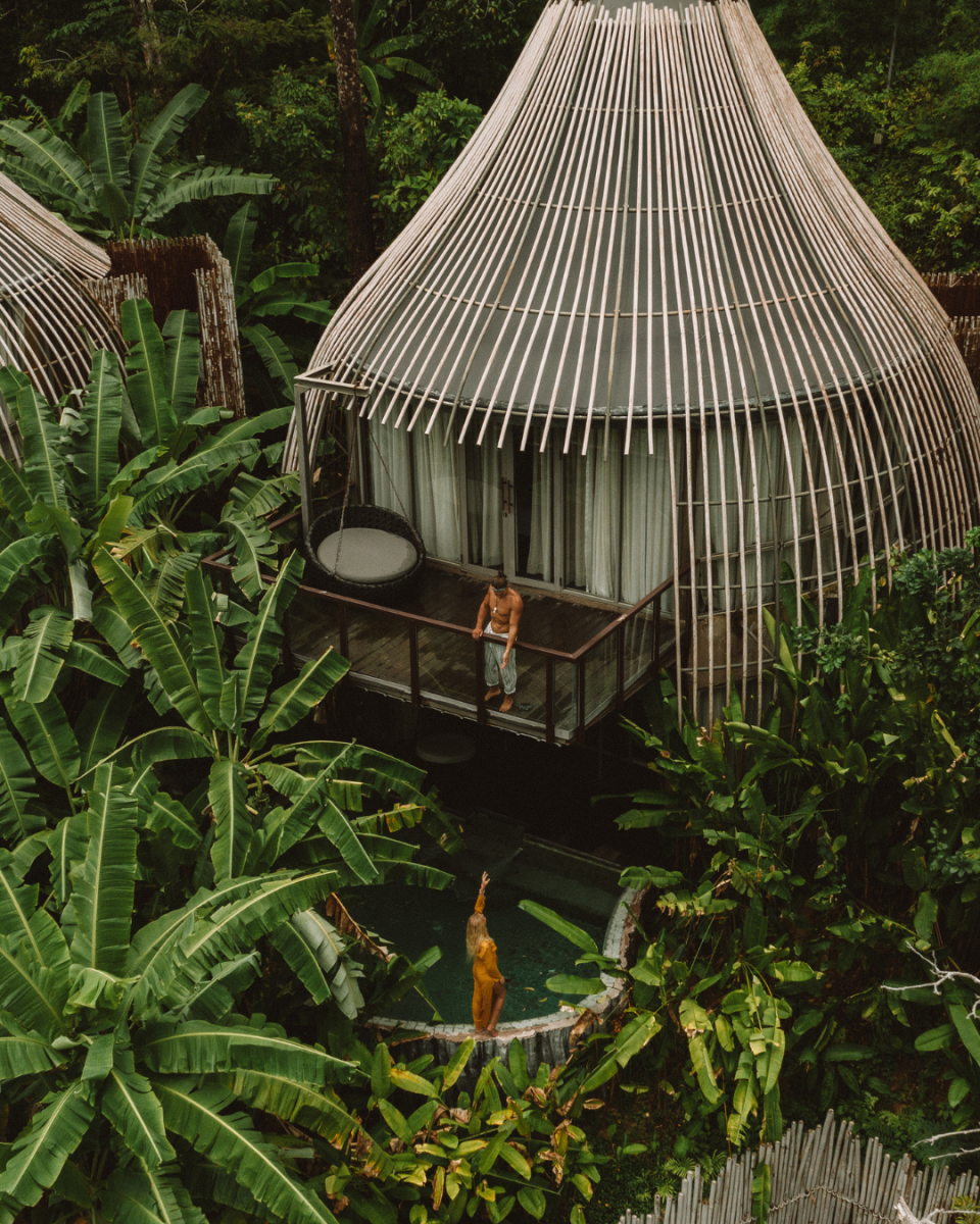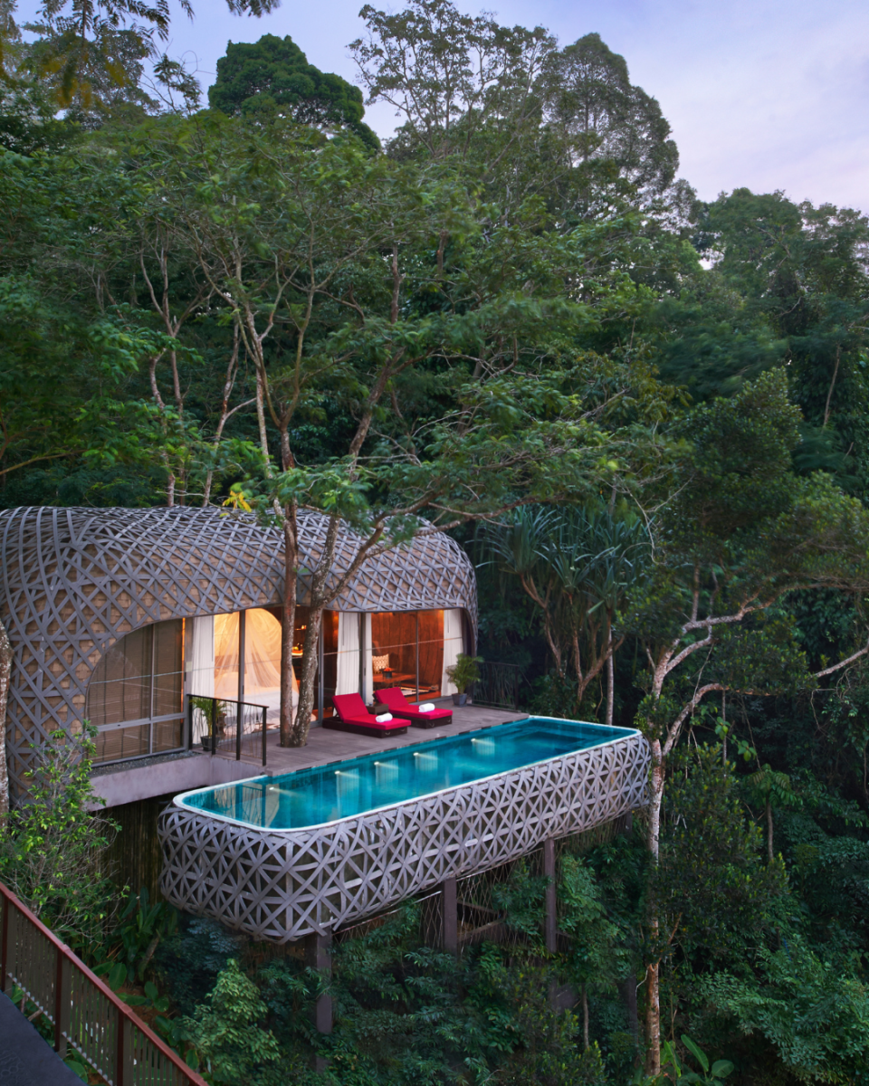The tree houses offer views of the rainforest and a spacious bathroom with a monsoon shower, outdoor shower, guest toilet, and freestanding bathtub. The villa measures 169 m², including the pool and outdoor relaxation area.