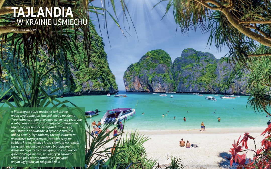 I kończy swój pasjonujący artykuł o rajskiej, uśmiechniętej Tajlandii w poniższy sposób: „Ciepły wiatr muska moją twarz, a nasz prom powoli dopływa do Ko Phi Phi Don w prowincji Krabi. To pierwsza z wysp w archipelagu Ko Phi Phi, który ma przed nami otworzyć drzwi do egzotycznego raju. Nasz skromny domek znajduje się tuż przy plaży, nad Morzem Andamańskim. Kolorowe łódeczki unoszą się na wodzie. Ceny na wyspie są wyższe niż w centrum czy na północy kraju. Nie ma tu kameralnej atmosfery, a lokalne restauracje, puby i dyskoteki pękają w szwach. Na plaży wieczorem odbywają się imprezy. Głośna muzyka dochodzi z każdej strony. To idealne miejsce dla młodych ludzi. Same nie możemy oprzeć się energii wyspy. Po chwili tańczymy razem z tłumem na piasku. Drugiego dnia płyniemy na wycieczkę w głąb archipelagu. Obok Ko Phi Phi Don znajduje się przepiękna wyspa Ko Phi Phi Leh (Ko Phi Phi Le), na której kręcono sceny do filmu Niebiańska plaża (2000 r.) z Leonardem DiCaprio w roli głównej. Cały dzień pływamy w czystym morzu i podziwiamy formacje skalne, nurkujemy w błękitnej lagunie (Pileh Bay, Pi Leh Bay), a przewodnik pokazuje nam najpiękniejsze miejsca. Dopływamy do małpiej plaży – Monkey Beach. Sympatyczne zwierzęta są już przyzwyczajone do turystów. Niektórzy dają im banany, my jednak tylko obserwujemy te urocze stworzenia z bezpiecznej odległości. Zachwycająca jest bezludna Ko Mai Phai – Bamboo Island, czyli Wyspa Bambusowa. To raj, który można porównać z samymi Malediwami. Turkusowe wody Morza Andamańskiego oblewają szerokie plaże z białym piaskiem. To moja ulubiona tajska wyspa. Mogłabym tu spędzić cały dzień. Zafascynowane wspaniałymi plażami ruszamy w dalszą podróż po prowincji Krabi. To tutaj można zobaczyć wapienne, majestatyczne klify wystające z wody, które tworzą niezwykłą scenerię. Płyniemy łodzią przez lasy namorzynowe. Mijamy groty, jaskinie, przepływamy przez wspaniałe laguny, aż wreszcie docieramy na malowniczą Khao Phing Kan – James Bond Island, czyli Wyspę Jamesa Bonda. To tu ponad 50 lat temu kręcono sceny do brytyjskiego filmu szpiegowskiego Człowiek ze złotym pistoletem (1974 r.). Popularne są także wycieczki na Ko Kai – tzw. Chicken Island. Faktycznie, nie trzeba zbyt bujnej wyobraźni, żeby dostrzec w tutejszej formacji skalnej głowę kurczaka. Ostatnie dni spędzamy, relaksując się w tym jednym z najbardziej urokliwych zakątków kraju. Tajlandia wciąga, porusza wszystkie zmysły i zostaje w sercu na zawsze. Powroty są tylko kwestią czasu.”