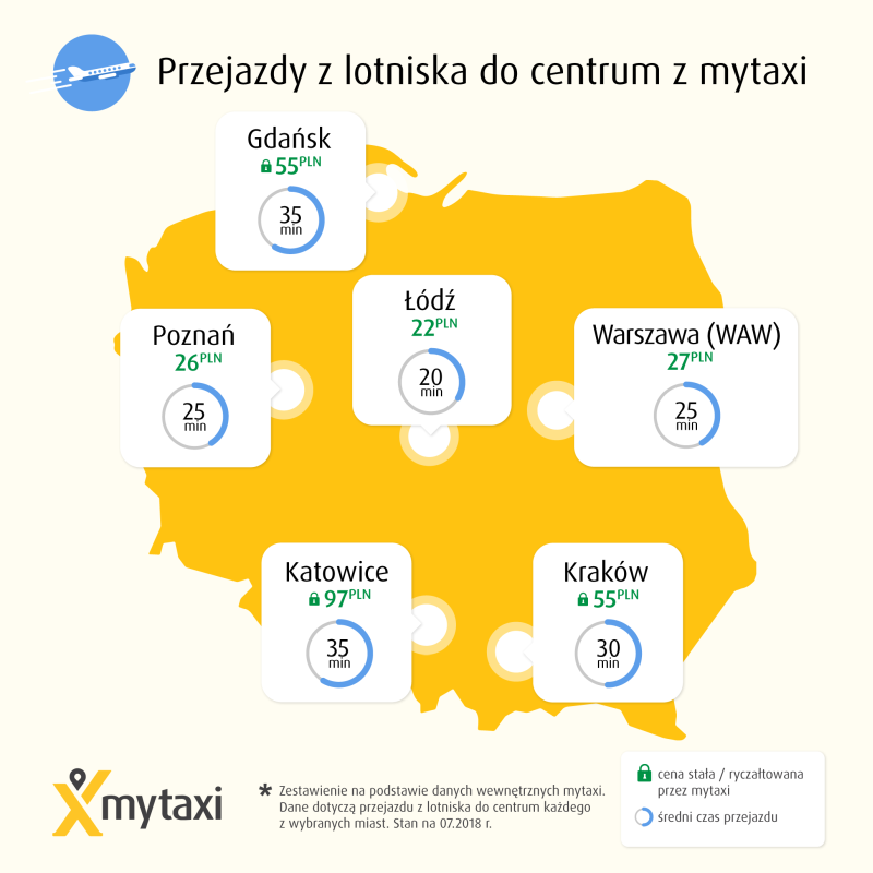 Nieco droższe w tej grupie są dojazdy taxi z lotnisk znajdujących się poza granicami miast, gdzie obowiązuje druga taryfa: w Krakowie, Gdańsku i Katowicach. W tych miastach mytaxi oferuje stałe opłaty ryczałtowe, wynoszące po 55 zł dla lotniska w Krakowie-Balicach i Gdańsku-Rębiechowie oraz 97 zł w Katowicach-Pyrzowicach. Średnia wartość napiwku przyznawanego kierowcom mytaxi, w polskich miastach, na trasach lotnisko-centrum miasta, wynosi 10%. Dodatkowo, przez cały lipiec wszystkie kursy mytaxi na dojazd i powrót z lotniska w Warszawie (Lotnisko Chopina), Krakowie i Gdańsku, z opcją „Płać przez Aplikację” są o 25% tańsze.