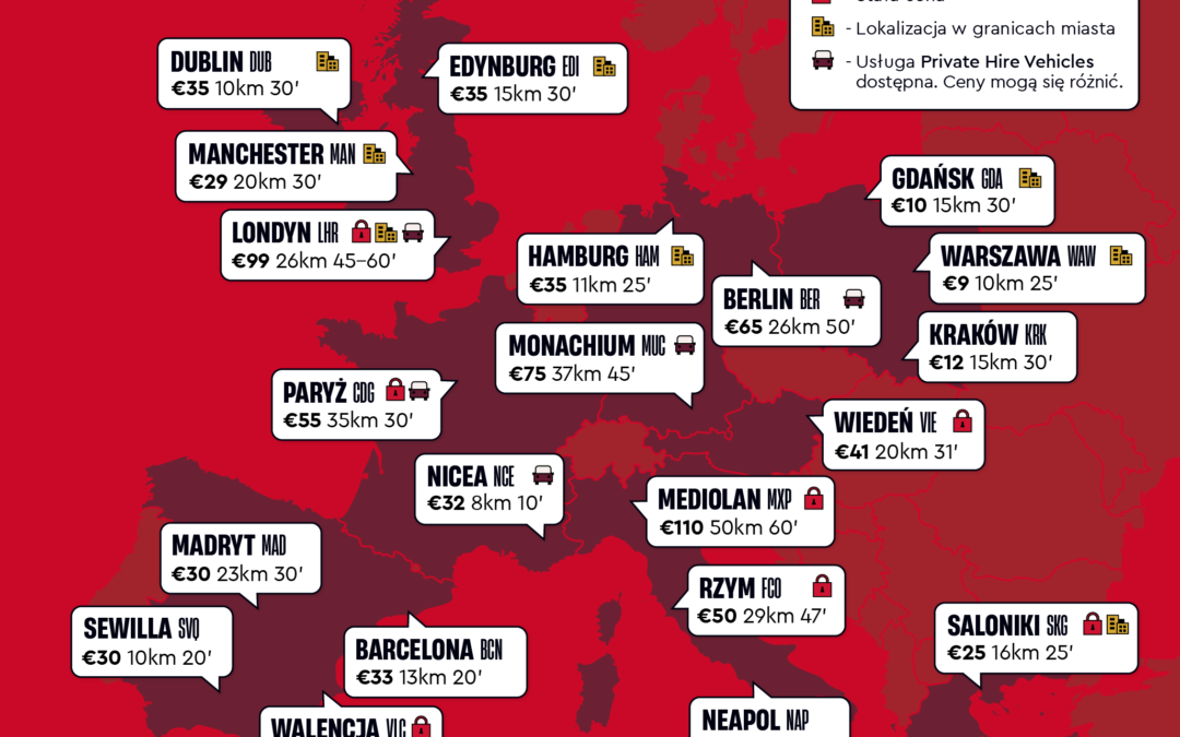 Według analizy FREENOW okazuje się również, że Warszawa i Dublin mają ze sobą coś wspólnego. Te europejskie stolice mają lotniska położone najbliżej centrum miast – w odległości około 10 km. Biorąc jednak pod uwagę opłaty za taksówkę, odwiedzający irlandzką stolicę muszą się liczyć z wyższym kosztem za transport, bo wynosi on około 35 EUR. W przedziale cenowym od 30 do 35 EUR za przejazd taksówką z lotniska znajdują się również niektóre miasta w Wielkiej Brytanii takie, jak Manchester i Edynburg, a także niemiecki Hamburg, który jest znany z jednego z największych portów w Europie.