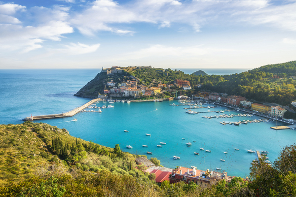 Porto Ercole village and boats in harbor in the bay. Aerial view. Monte Argentario, Maremma, province of Grosseto, Tuscany region, Italy