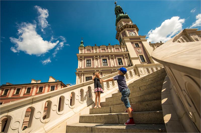 Zwiedzanie współczesnego Zamościa warto rozpocząć od centralnie położonego Rynku Wielkiego. Ten ogromny kwadratowy plac – każdy z jego boków liczy 100 m – stanowi główne miejsce wydarzeń kulturalnych, rekonstrukcji historycznych, koncertów i spotkań. Dominuje nad nim wspaniały, majestatyczny Ratusz (pełniący funkcję siedziby władz miejskich od chwili wybudowania pod koniec XVI w. do dzisiaj) z wysoką, 52-metrową wieżą zegarową i reprezentacyjnymi rozłożystymi schodami, które często stają się scenografią sesji fotograficznych i realizacji filmowych. Na parterze budynku mieści się wejście do Zamojskiego Centrum Informacji Turystycznej i Historycznej. Merytoryczne i ciepłe wsparcie jego pracowników pomogło mi w zaplanowaniu konkretnych tras poznawania miasta. Wielobarwne, bogato zdobione renesansowe kamienice tworzą tło dla widowiskowych jarmarków, festiwali i rekonstrukcji historycznych. Usytuowane w podcieniach i piwnicach tutejsze kawiarnie, sklepiki i galerie wabią przechodniów tradycyjnymi witrynami. Przeglądając karty dań zamojskich lokali, warto poszukać lokalnych smaków, np. zupy z pokrzywy, cebularza, gryczaków (kotlecików gryczanych), dań z leśnych grzybów i pierogów z owocami.